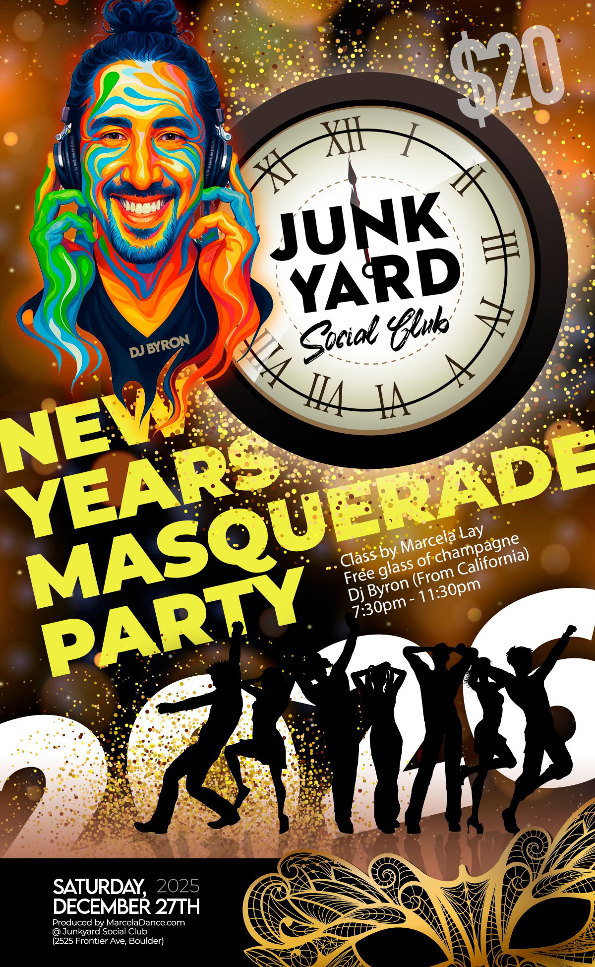 Junkyard Social Club 2525 Frontier Avenue, Unit A, Boulder, CO, United StatesYou are cordially invited to an evening of elegance, music, and celebration among friends. Why wait for New Year’s Eve? when we can toast together beforehand? Join us for an elegant MASQUERADE gathering, where mystery meets festivity. Let’s make it an unforgettable night of dancing, laughter, and connection.